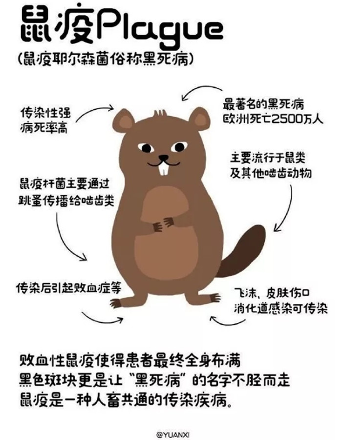 鼠疫(plague)是由鼠疫耶爾森菌感染引起的烈性傳染病,鼠疫為自然疫源性傳染病,主要在嚙齒類動物間流行,鼠、旱獺等為鼠疫耶爾森菌的自然宿主。鼠蚤為傳播媒介。本病傳染性強,病死率高。