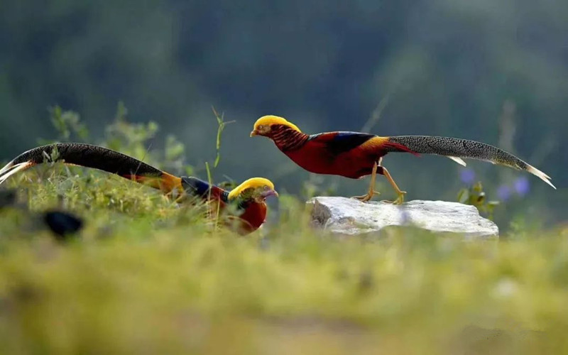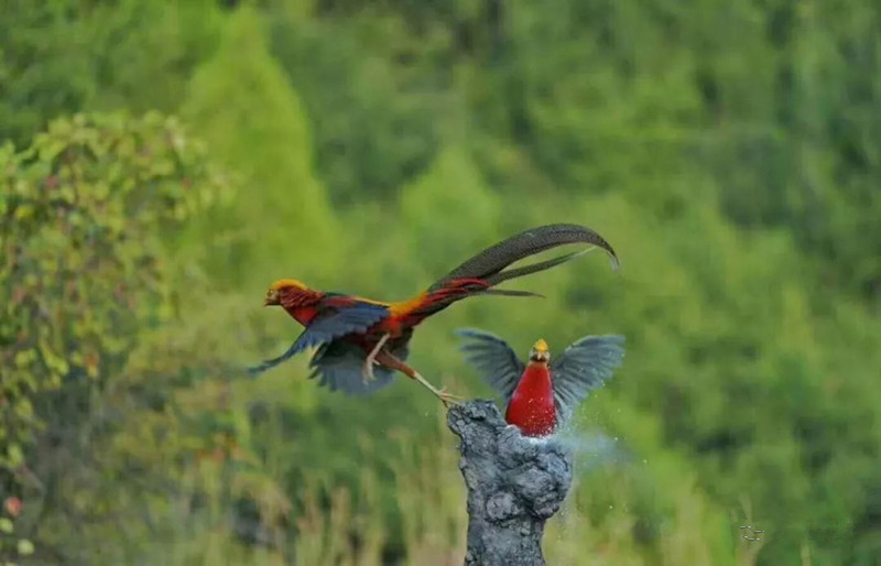 每年3月,錦雞會進入繁殖期,這也是在秦嶺觀賞錦雞的最佳時期。錦雞是一雄多雌制的家庭,通常1只雄鳥會擁有2—4只雌鳥為伴。雄鳥占據(jù)一塊山地,發(fā)出“察、嘎、嘎”的啼叫,吸引雌鳥前來交配,而它的競爭者,會來向它發(fā)起挑戰(zhàn),兩個雄性相遇,先是彼此炫耀羽毛的艷麗,一些自慚形穢的雄性錦雞,很快就敗下陣來,羞愧離去。而一些好斗的美麗雄性錦雞,則不會善罷甘休,硬要斗個你死我活,美麗的錦雞打斗場面,人們都說看到過,卻很少有圖片佐證,倒是錦雞文雅的炫耀羽毛的場面,人們常常見到,大概秦嶺山中的錦雞,頗有些紳士的風度。